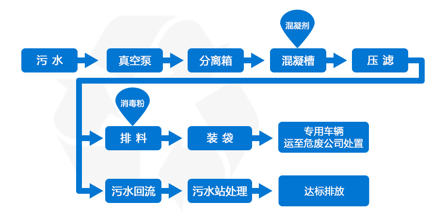該車通過水環(huán)真空泵將化糞池內(nèi)的污水自吸進(jìn)入分離箱中,通過分離箱中的滾筒,將污水中不可降解的無機(jī)物分離出來,并甩干;分離后的污水經(jīng)過頂部污水箱自流至混凝箱,同時(shí)加藥箱中的藥水通過加藥泵注入混凝槽,分離后的污水和藥水在混凝槽中充分反應(yīng)凝結(jié)后,自流至疊螺機(jī),進(jìn)行疊螺脫水,通過板框壓濾機(jī)將污水中的污泥擠壓成泥餅,在排料過程中與消毒粉混合,在密封袋中反應(yīng)、消毒,分離后的污水回流到污水處理站繼續(xù)按規(guī)范進(jìn)行處理,從而不會造成污水不達(dá)標(biāo)外排。該車型對所有可絮凝的污水,均能很好的處理效果。